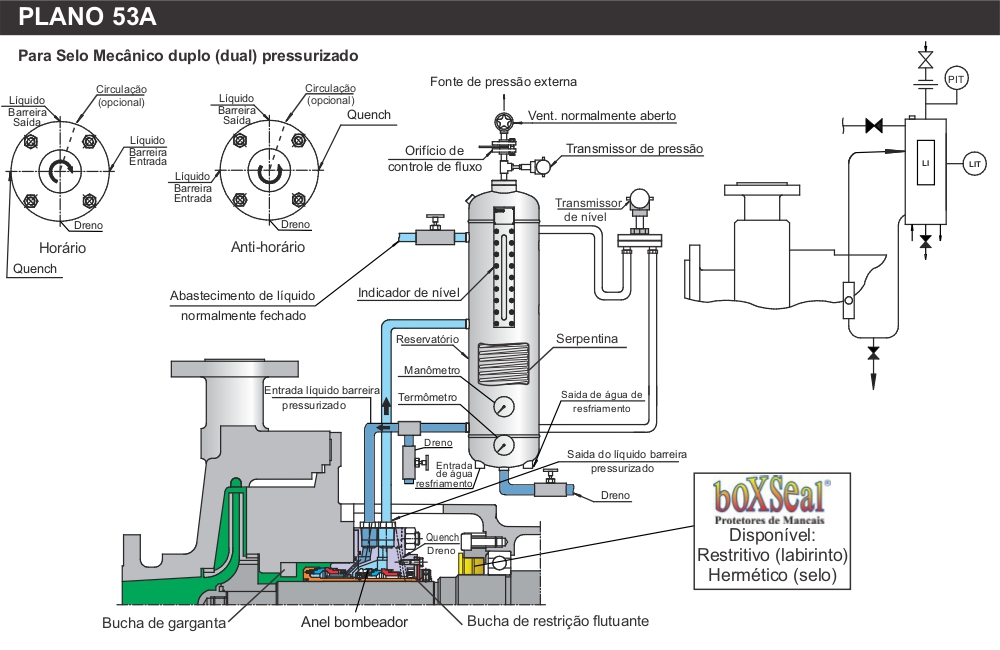 O Plano 53A utiliza reservatório externo pressurizado que mantém o líquido de barreira em pressão superior à da caixa de selagem.